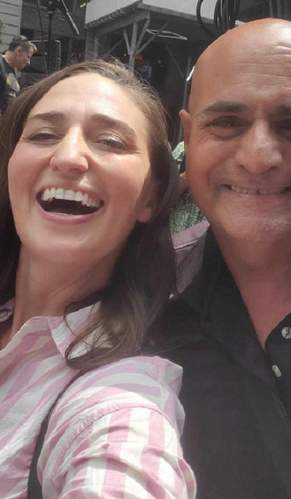 | Beautiful young women rarely smile so widely when making physical contact with me, these days. The enchanting, multi-talented and multi-Award winning musical theater rock star, Sara Bareilles, grabbed my phone and took a selfie of us, at a Writer's Guild protest and outdoor theater event, in 2023. |